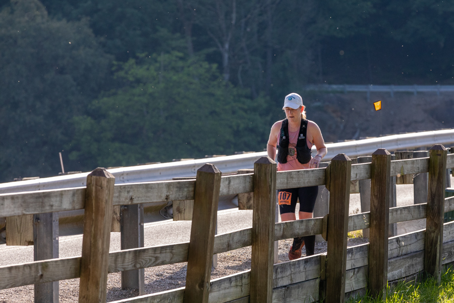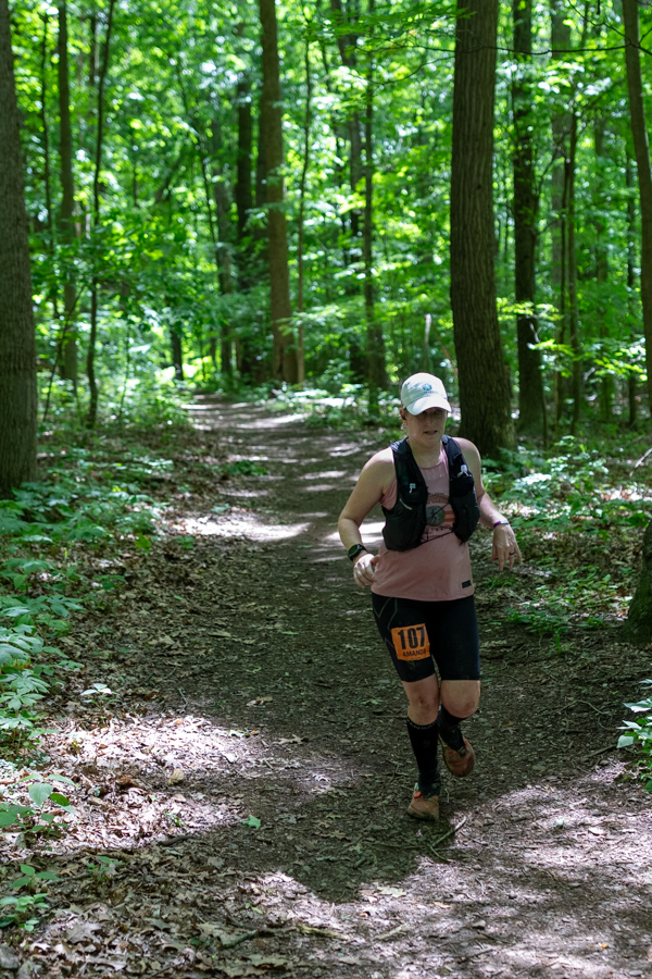 I had now seen the course, so I was more familiar with the tougher sections but also where I could move faster. The field was spread out as I began the second loop, and I knew it would start heating up. Luckily, the trails are very shaded, so we didn’t have the sun blazing down on us. Other than a fall, the second loop was much like the first. The woods were active with critters. Several chimpmunks darted across the trails, and I encountered a snake and deer during the day. Eventually, I hit the 50 mile mark close to the time I had planned, but I knew those short, steep climbs would be challenging and hurt on the last loop.